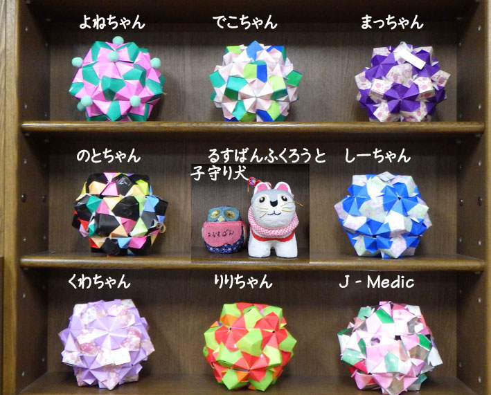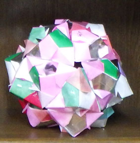 このサツキボールは普通のくす玉とはパーツの形も違って組む作業を苦手がる人が多くて、「組む脳トレ」の時は必ず一回は練習をしてもらっていました。その甲斐あって今回組む段階で困っている人はいませんでした。みなさん結構楽しんで作られたようなので、良かったなと思っています。いつも思うことですが、形が同じでも折り紙の色や配色によって雰囲気が違うのが面白いなと思います。 |