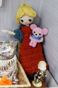 一月の25日ぐらいはとても寒く、思わず美夏ちゃんにも温そうな恰好をしてもらいました。さらにおなかが暖かくなるかと縫いぐるみを膝に抱かせてみました。 |