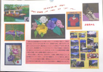 | 楽しみな『好きな花コレクション』百合の花、カトレア、チューリップ、カーネーションの花束、生垣のバラ(佐藤ローズ)とガク、葉っぱ、朝顔、紫陽花、佐藤ローズとクレマチス。などなど花を折るだけではなく、花器と申しますか、どのようにして花を作品にするかにみんな頭をひねりました。 |