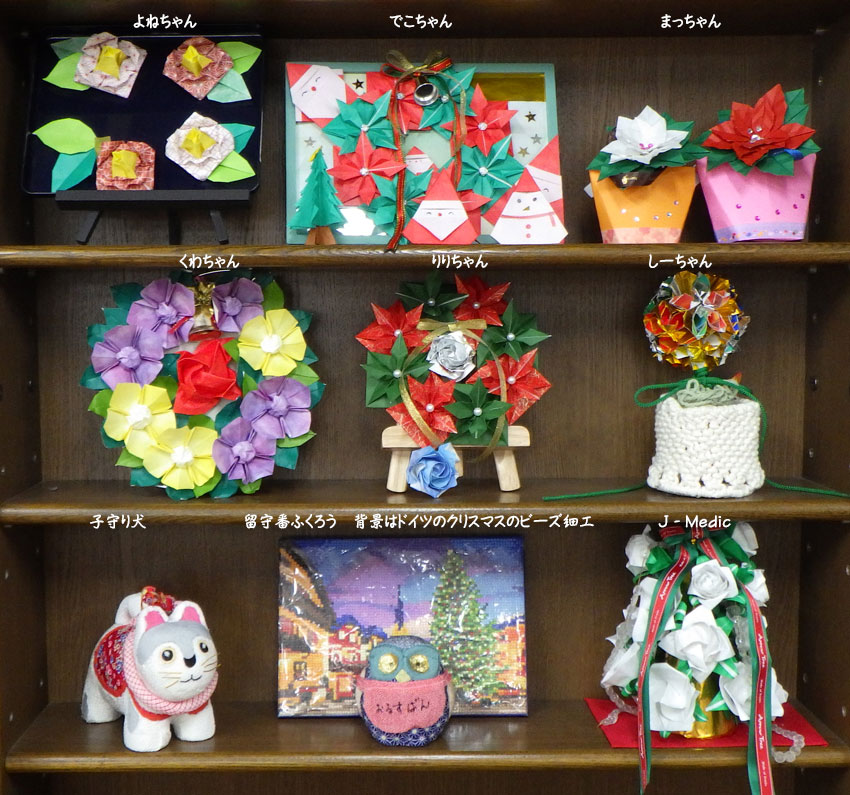 | 2024.12.1 好きな花飾りの中でも12月のは見ていて楽しい。日本は宗派なくクリスマスもお祝いしていいとなっているので、助かる。椿やポインセチア、クリスマスローズや、球形に刈り込んだようなトピアリー、そしてありふれたバラのツリーなどにぎわっています。展示場所が天井が低くせっかくの作品も伸び伸びとはいかないところが残念なところ。それぞれの事情で参加できない方々が徐々に増えてきているので、子守り犬やお留守番ふくろうで場所埋めをしてもらっています。多人数の時は多人数なりの、少人数になってくればそれなりに楽しめばいいと思っています。 |