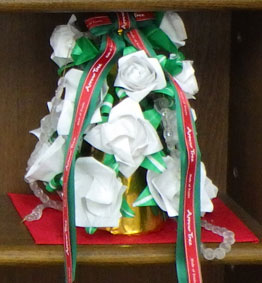 私の作品です。実はクリスマス月にはぜひともこの形にしたかったので少し前に練習をしています。下の方を見ていただくと9月の時に色とりどりのバラのツリーを出品しています。けっこう深い色のバラ達もそれなりにいい感じですが、白いバラばかりにしたらどうなるだろうかとやってみました。ちょっと凝った紙を使ったのですが、全くわかりません。でも、その分少し分厚くなっているのでしっかりしたバラになりました。下の方にはマジカルローズやトゥイスティックローズなど同じ紙の大きさでも大きな形に仕上がるモノ、そして、上の方にはちょっと手強いですが、小ぶりな可愛い感じのバラになる佐藤ローズを持ってきました。中ぐらいの大きさになるマコトローズや川崎ローズもどこかに居てるでしょう。白だけでは寂しいので緑のガクを各々の花に付けました。リボンもあり合わせですが、緑に赤。敷物も赤にしてクリスマスの雰囲気を出したつもりです。ちょっとキラキラするものも巻き付けてますが、あまり目立ちません。ぜんぜんOKですが。楽しんで作りました☆ |